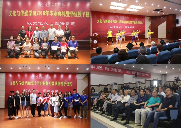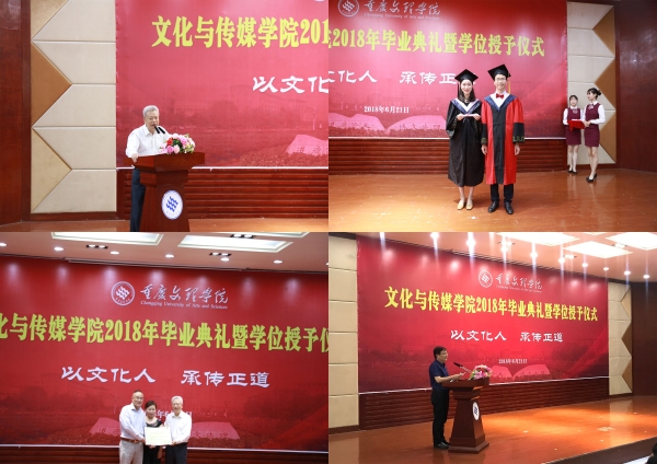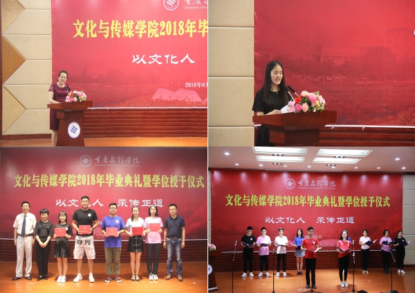 6月21日上午,我院2018届毕业典礼暨学位授予仪式在博文馆101隆重举行。校党委书记孙泽平、副校长万书辉,校友总会会长原校党委书记钟志奇、校友总会办公室主任谢华琳、81级校友三峡联合职业大学陈亿董事长及夫人李荣春女士、CCTV少年中国行重庆小记者站站长曾静、文化与传媒学院院长李天福、副院长李芹燕、院长助理王长武、教师代表以及2018届毕业生共计300余人参加了毕业典礼。典礼由党总支书记白成良主持。