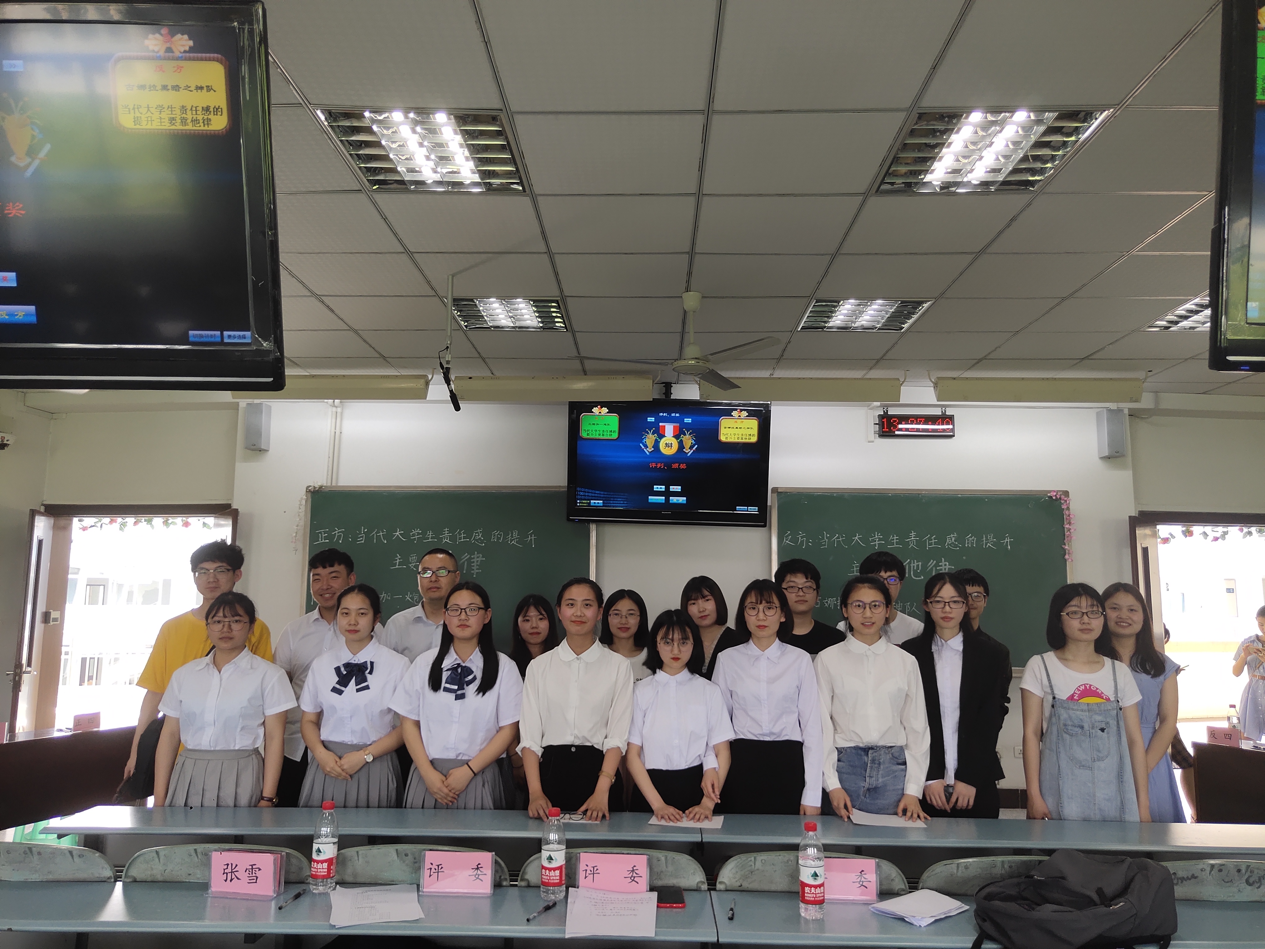 比赛共分初赛、复赛、决赛三部分,经过激烈的层层角逐,18级广播电视学专业辩论队和18级汉语言文学师范专业辩论队闯入决赛。在决赛阶段,双方就“当代大学生责任感的提升主要靠自律还是他律”的问题展开辩论。正方广电代表队认为当代大学生责任感的提升主要靠自律,而反方汉师代表队则坚持主要靠他律的观点。双方选手在立论、质询、攻辩和小结等各个环节中思路清晰,引经据典,字字珠玑,使现场气氛迅速升温。在随后的自由辩论中,双方选手就辩题展开更深层次的辩论,选手们个个妙语连珠,舌绽莲花,一次次将比赛推向高潮。最终,18级汉语言文学师范专业代表队获得胜利,来自18级广播电视学专业的周洋娟摘得“最佳辩手”的称号。